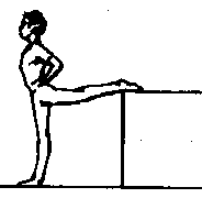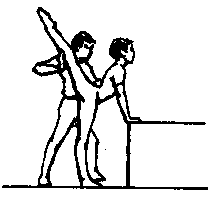 [动作方法]侧对肋木站立,单手扶肋木,外侧腿脚背放至肋木上脚面绷直,压腿时上体后仰,也可两人练习。帮助