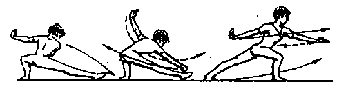 [教材要点]一劈、二按、三穿、节奏明显、上体随之转动。