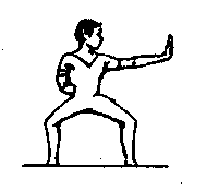 预备式:并步站立. 左脚向左侧上一步,上体左转90度;左手向左搂手握拳,拳背朝下。上动不停,右腿前上一步成马步;左拳收至腰间,右掌向前推击的同时、上体向左拧转90度,目视右掌。