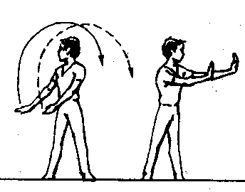 [教材要点]两臂划圆,至左侧时坐腕立掌,摆臂时两肩放松,身体随之微转。